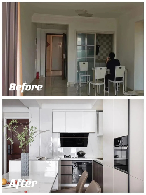 改动后的厨房变成了开放式,原来与玄关隔断的墙体消失不见,餐厅干脆和吧台连成了一个整体。
