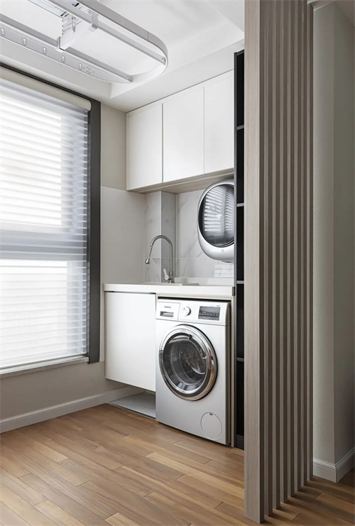原来的阳台分出一部分包进客厅,改为兼顾洗晒衣物和休闲的多功能区。洗烘一体机搭配阳台上的智能晾衣架,哪怕是封闭阳台也不怕潮湿问题。