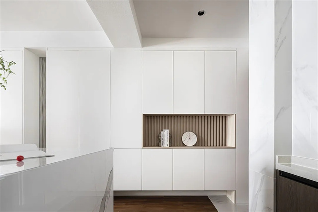 玄关柜借用了一部分原来墙面内陷的空间,外边框与门框齐平,不会影响到过道走廊。