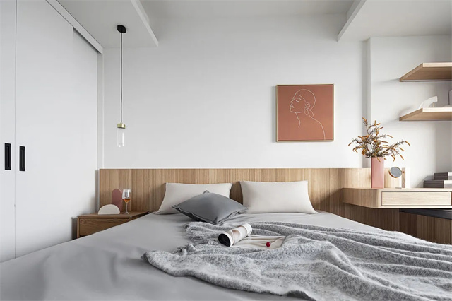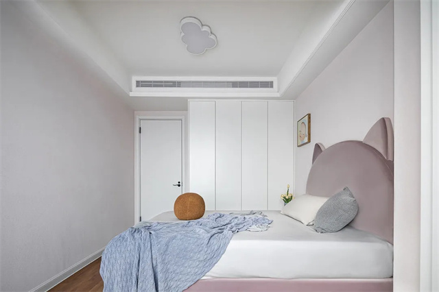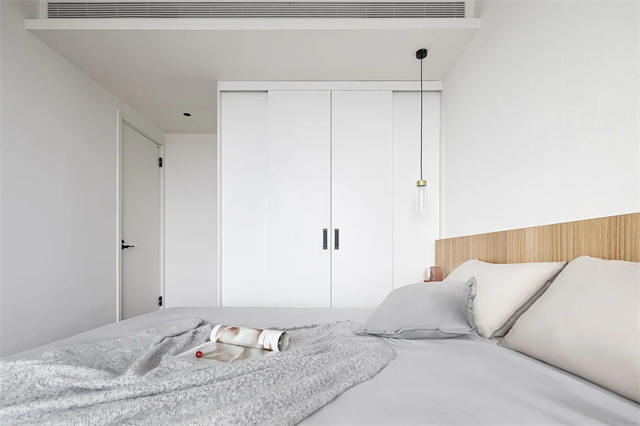 卧室和客厅一样采用了无主灯设计,同时对中央空调的出口做了隐藏化处理。对于吊顶的积灰问题,设计师选择用硅藻泥来解决,这样更不容易积灰。